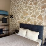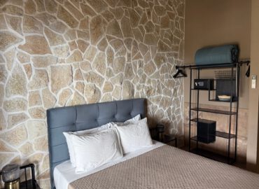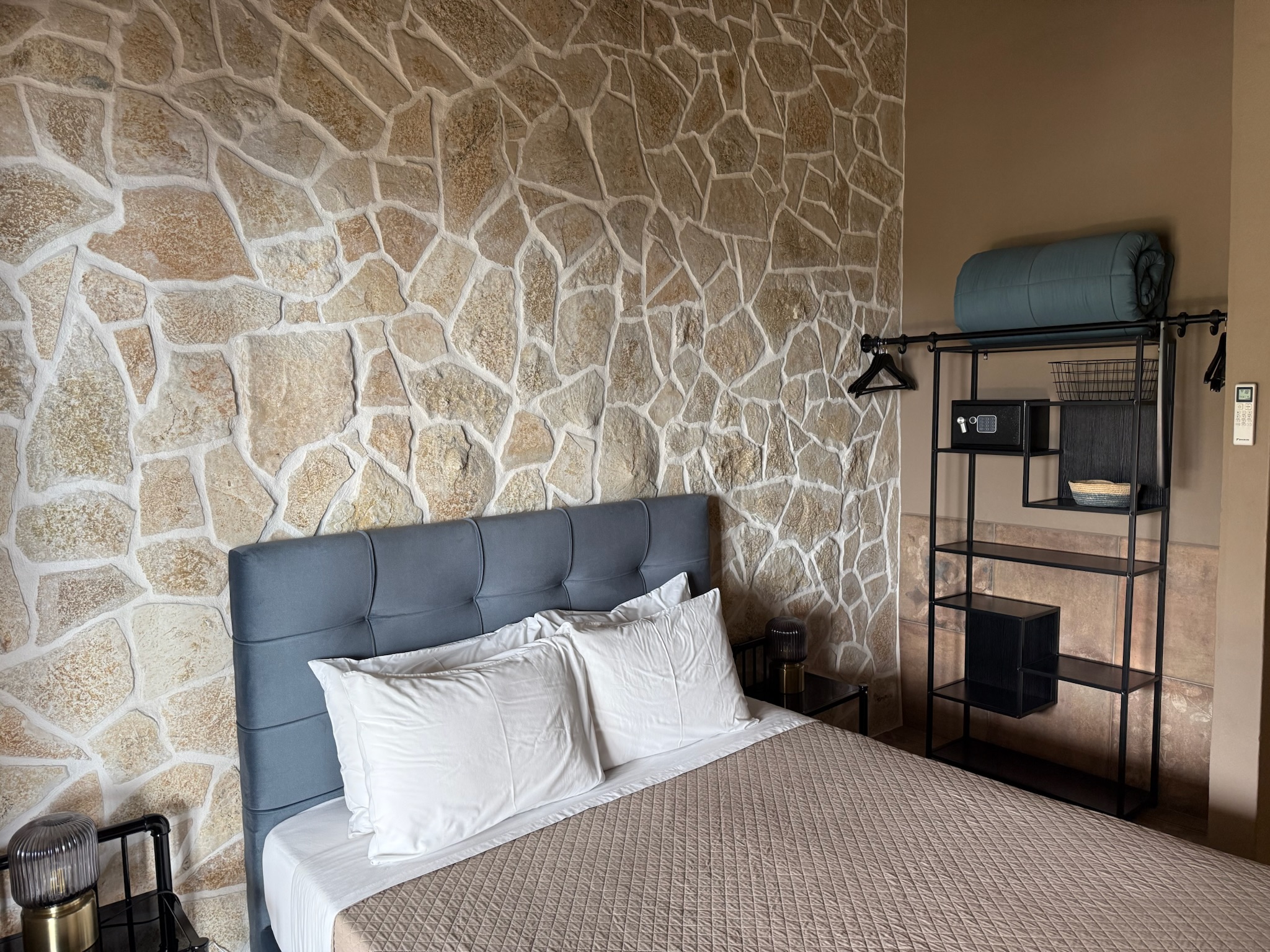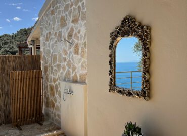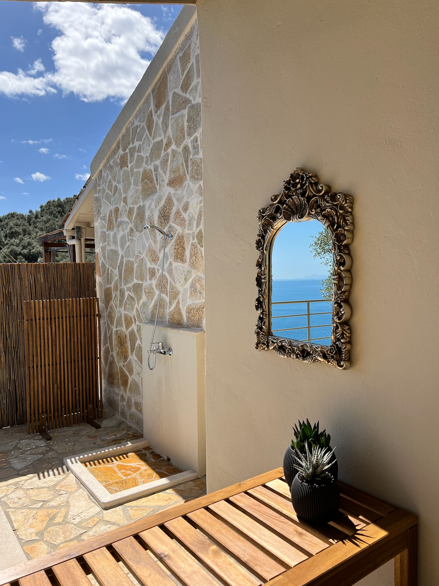 This large apartment has 2 bedrooms with enough closet space, but also a lovely lounge with a large sofa which can be used as an extra bed. The fully equipped kitchen has a dining table, but of course you may prefer to eat outside while enjoying the sunset. You can enjoy the view of Kaminaki bay from the comfort of your own private terrace, which has a lounge set, dining table and lovely sun loungers. This apartment also has its own plunge pool and outdoor shower.